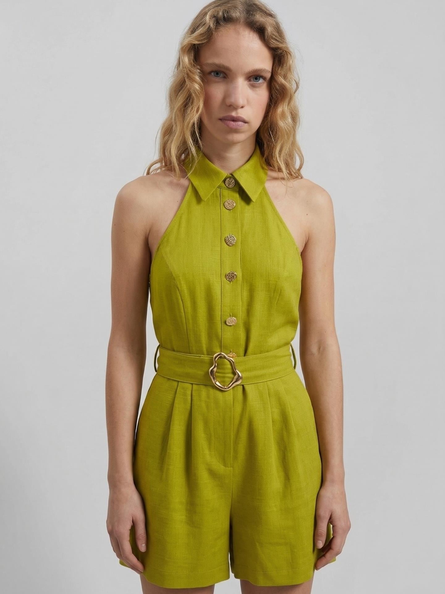 Düğme Detaylı Halter Yaka Şort Tulum Yeşil