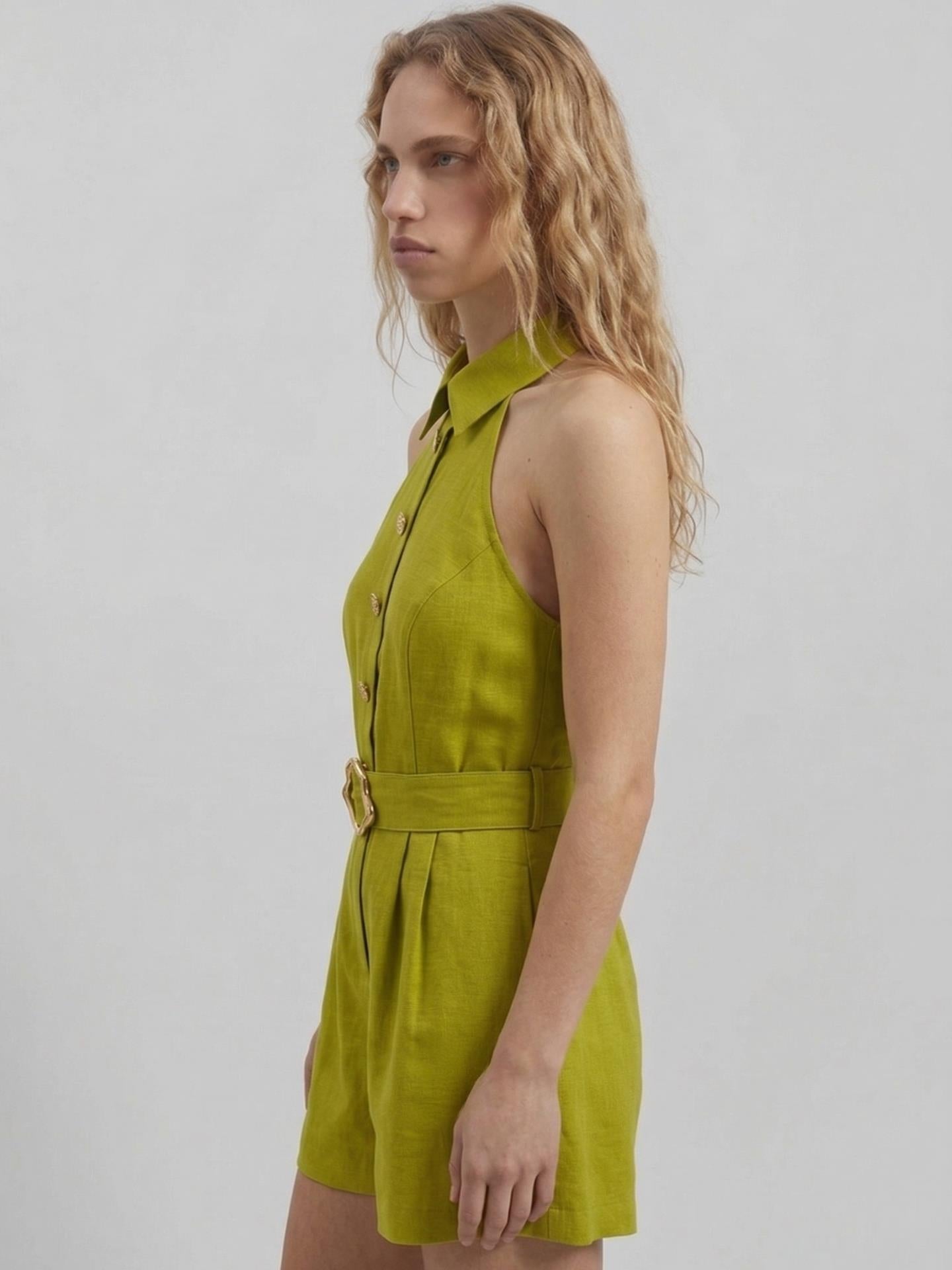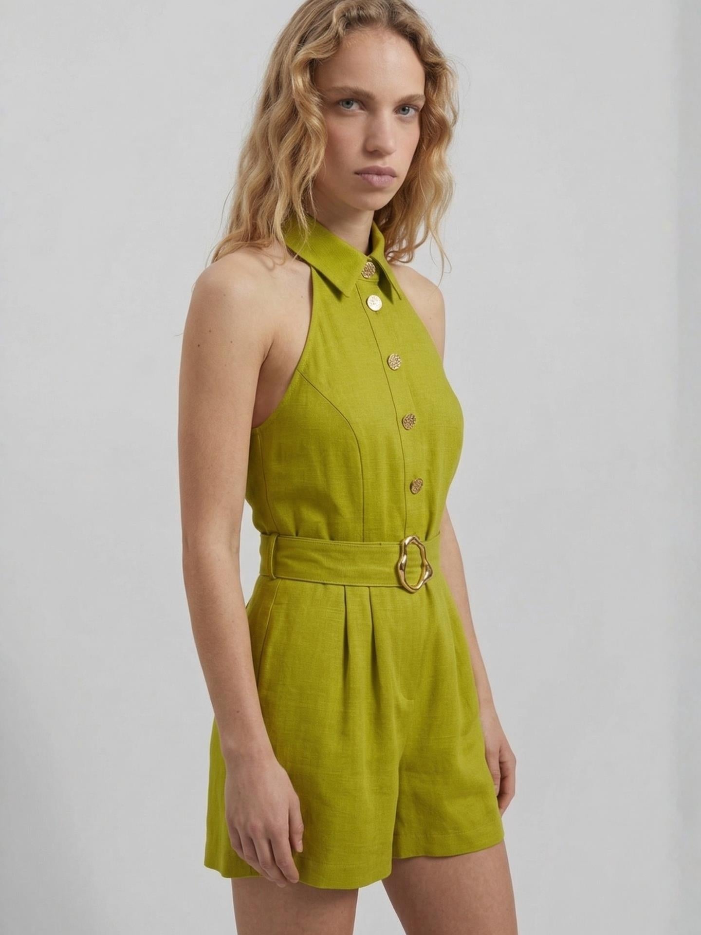 • Düğme Detaylı Halter Yaka Şort Tulum Yeşil