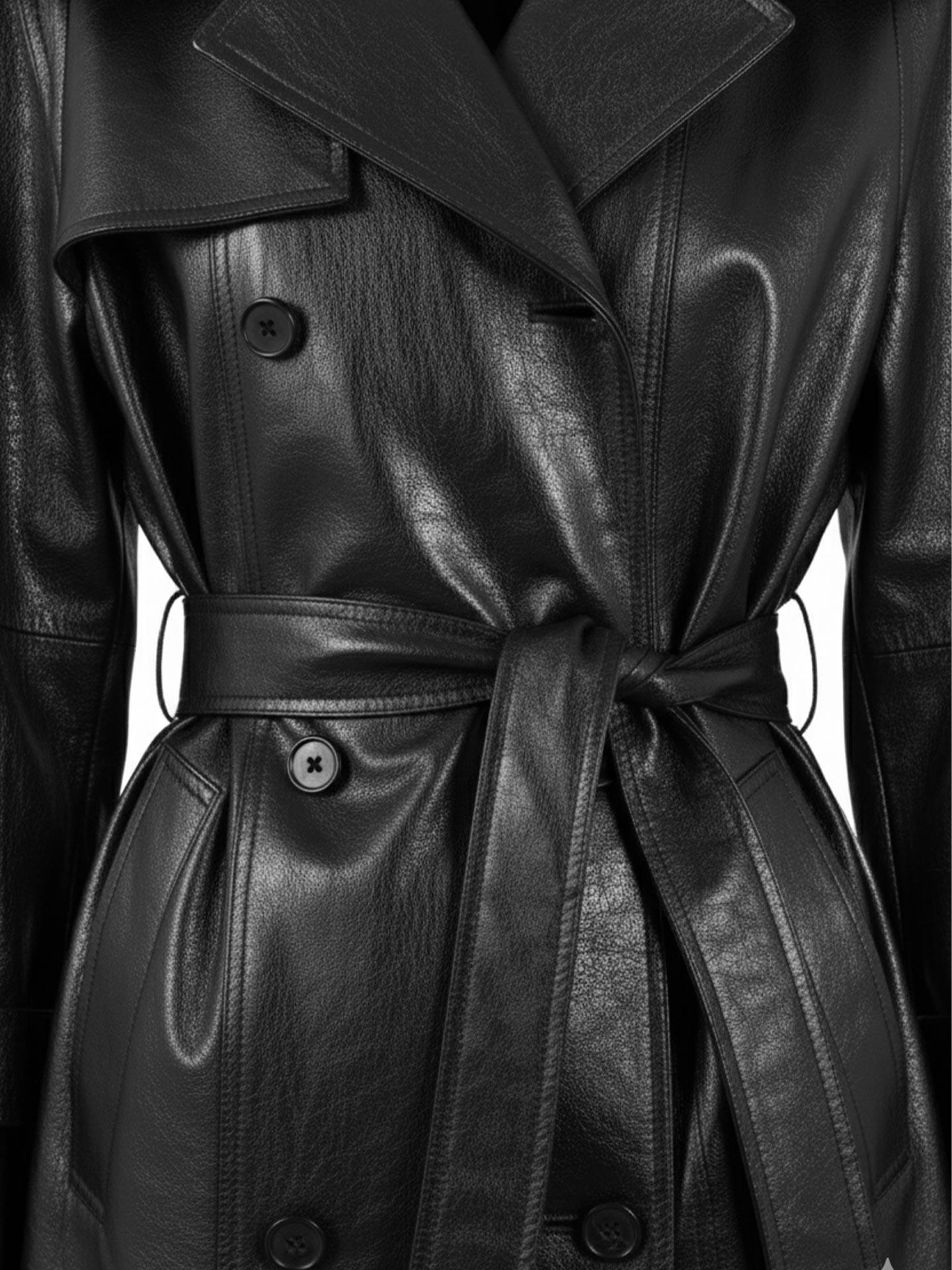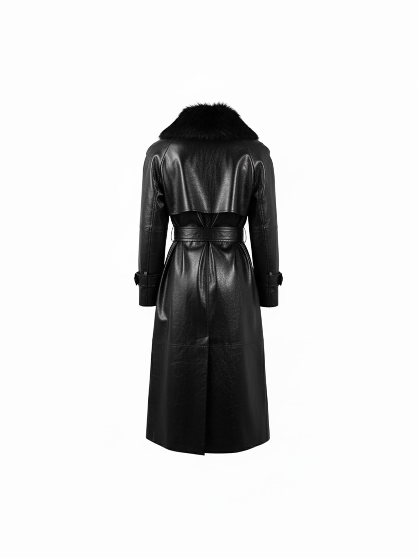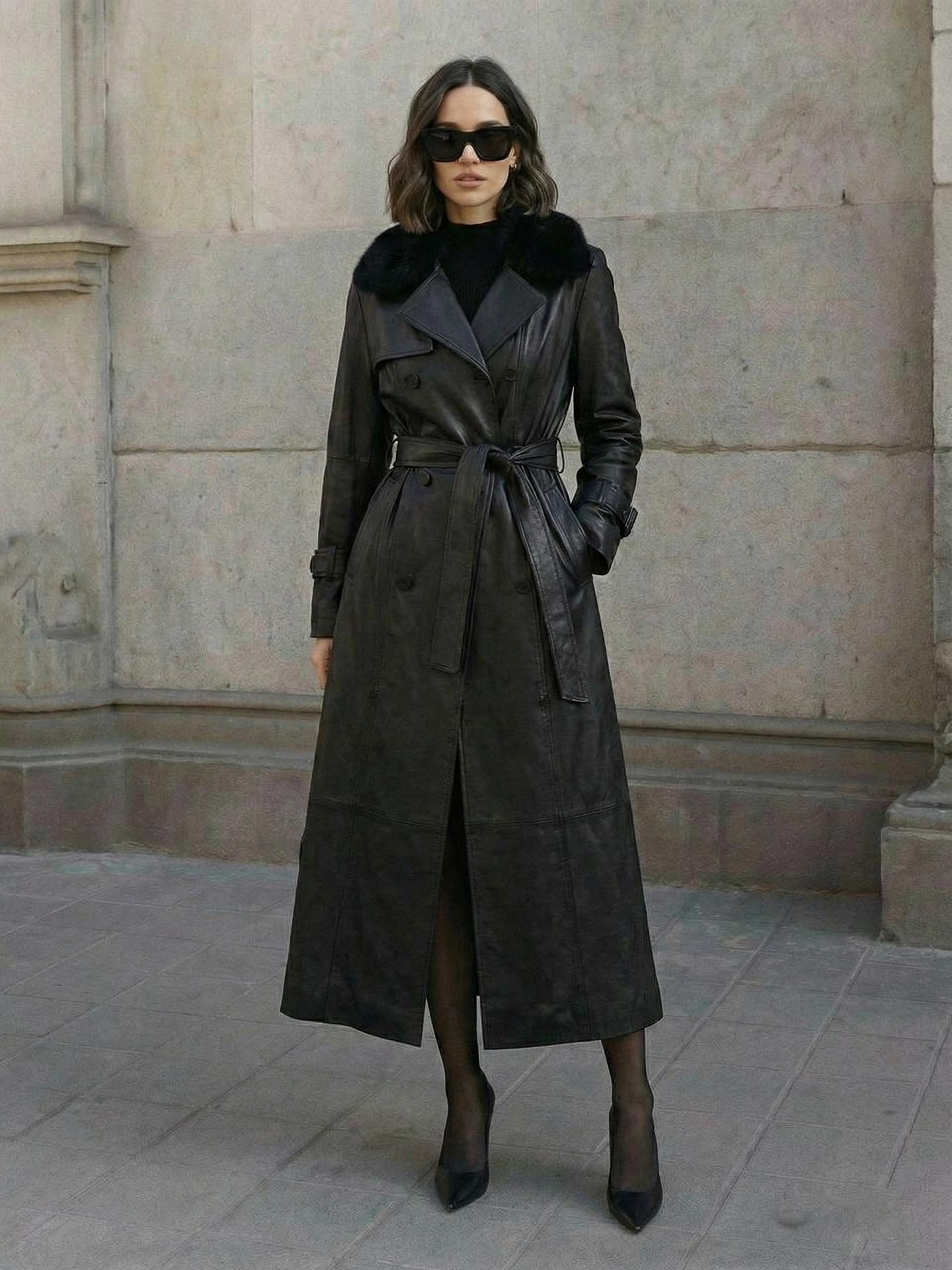 Kürk yaka detayıyla zenginleşen bu siyah deri trençkot, güçlü ve zarif bir siluet sunuyor. Şıklık ve karakteri bir araya getiren iddialı bir parça.