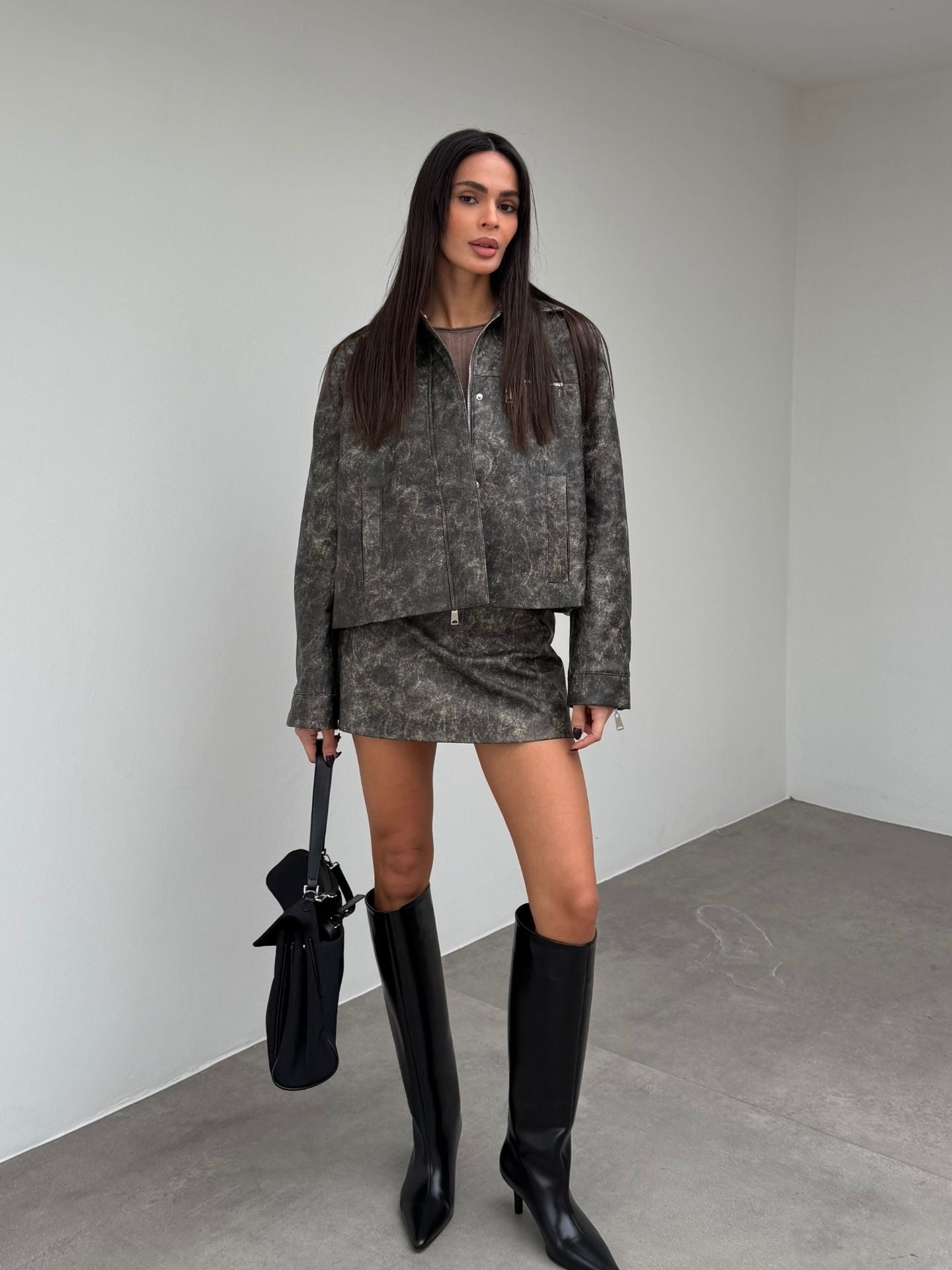 Zamansız bir duruşa sahip bu gri ceket, eskitme deri yaka detayıyla karakter kazanıyor. Modern çizgilerle birleşen vintage dokunuş, sofistike bir görünüm sunuyor.