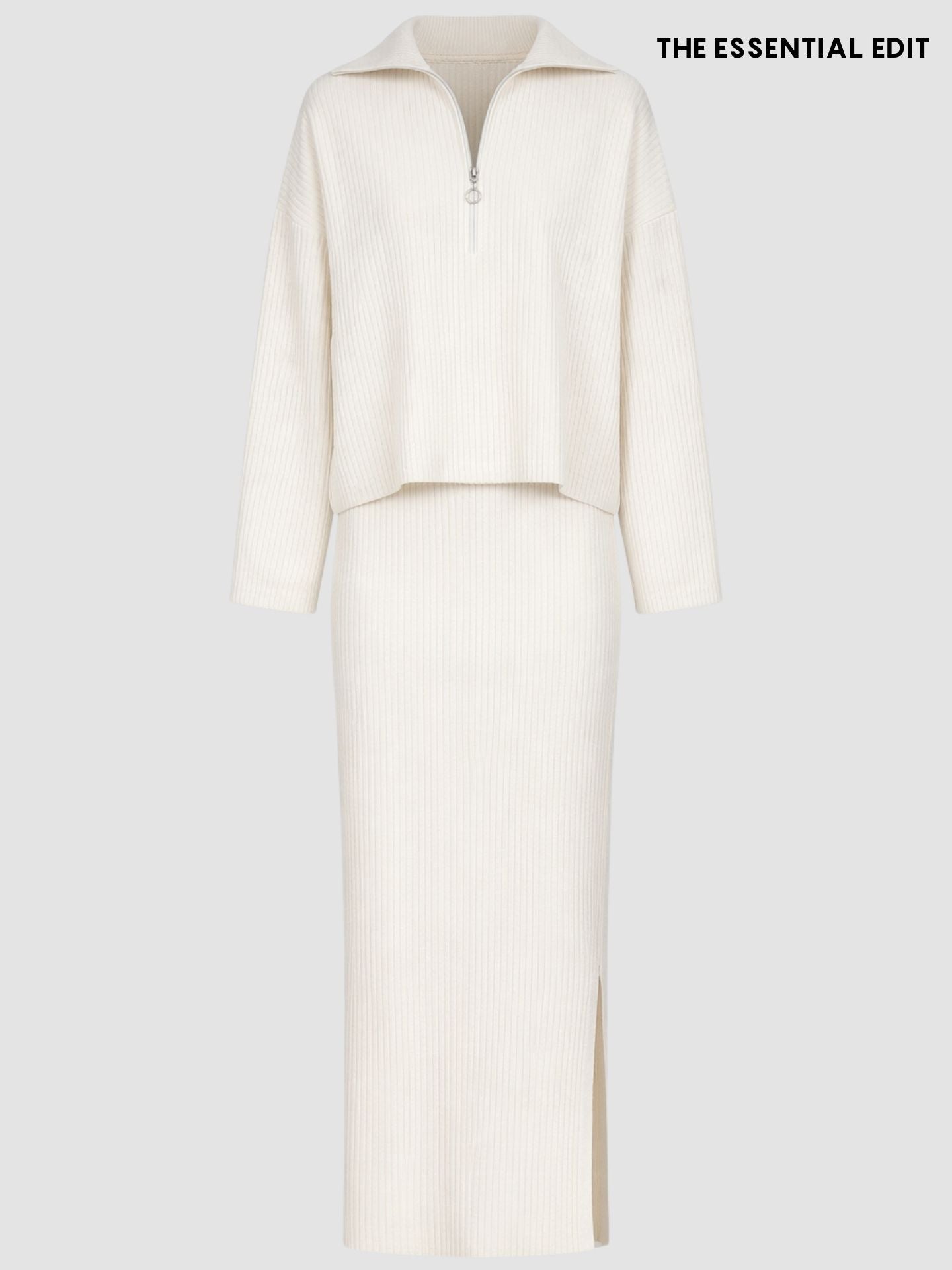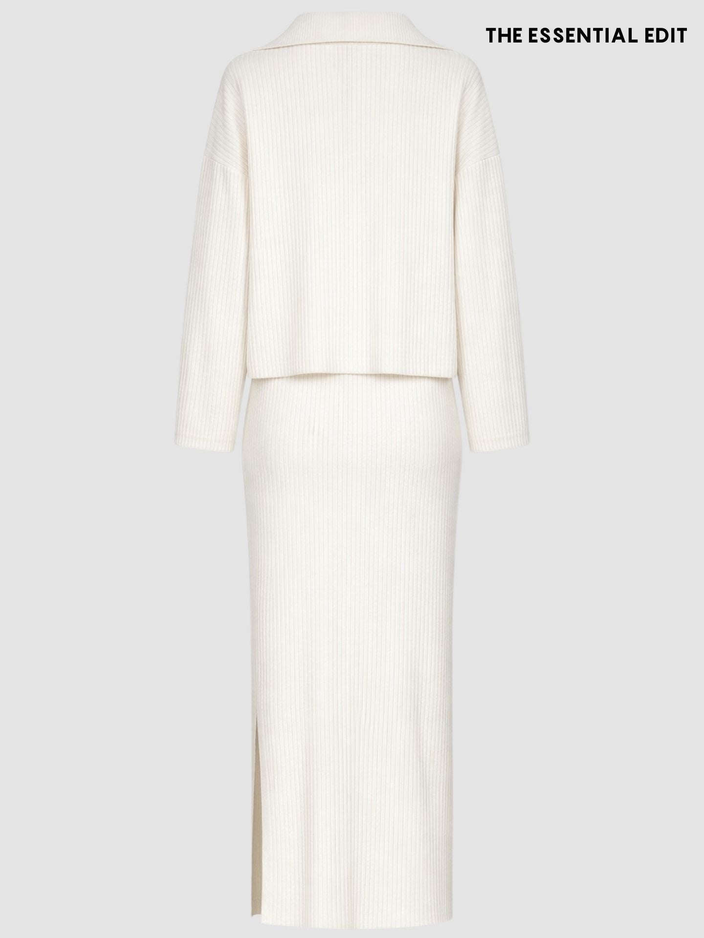 Zamansız tasarımı ve yumuşak dokusuyla öne çıkan bu triko takım, günlük şıklığı zahmetsizce tamamlamanız için tasarlandı. Dikey fitilli dokusu vücuda zarif bir form kazandırırken esnek yapısı gün boyu konfor sağlar. Yarım fermuarlı üst parça sportif ve modern bir duruş sunarken, yüksek bel midi boy etek feminen silueti ön plana çıkarır.