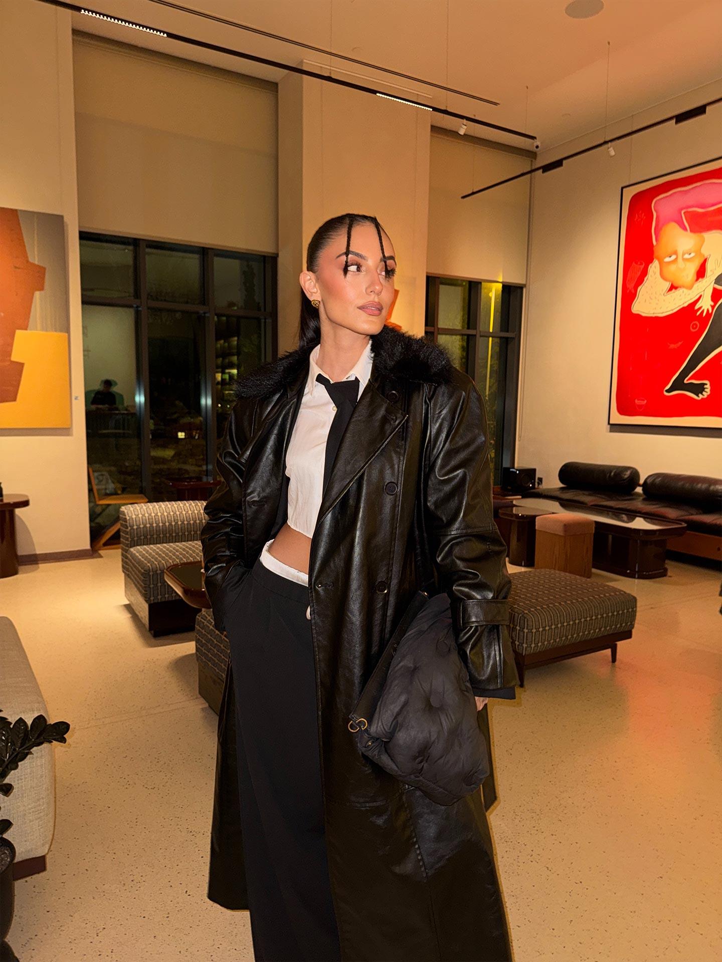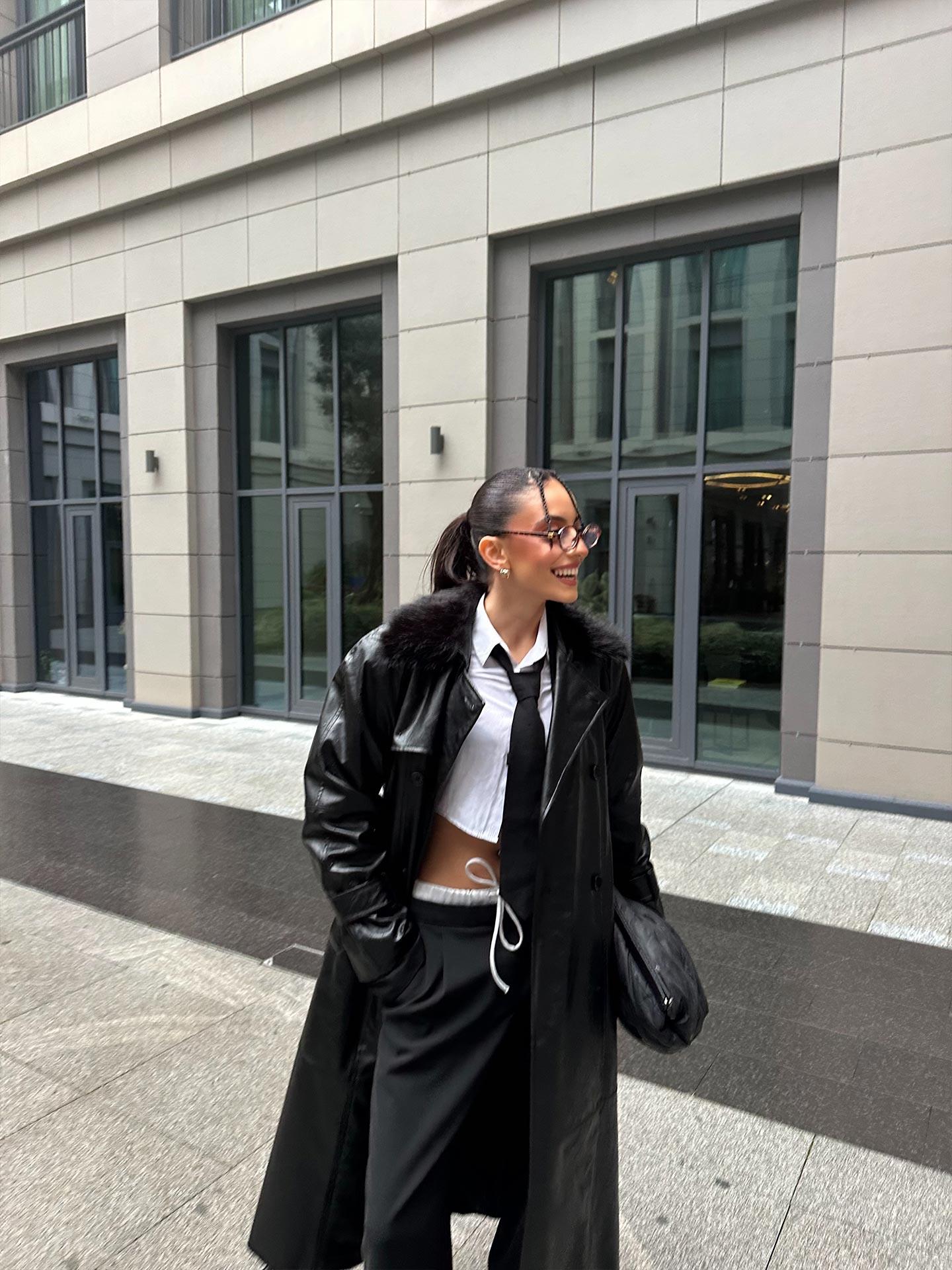 Kürk yaka detayıyla zenginleşen bu siyah deri trençkot, güçlü ve zarif bir siluet sunuyor. Şıklık ve karakteri bir araya getiren iddialı bir parça.